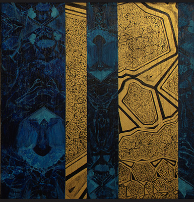 Her environments are inundated by decorative motifs from various cultures and time periods, which are transubstantiated into music of the universe. Moreover, in order to activate associations for the multi-dimensional depiction of complex human relationships, of boundaries and balances, she enriches her paintings with levitating parallel universes in the form of amazing fractals. These are fragmented repetitive geometric or flower-bearing motifs, interspersed or carefully placed at key points, which provide a magical dimension to each work, as well as a latent spirituality.