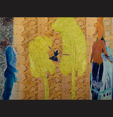 Earthy and golden tones; red and blue backgrounds; kaleidoscopic compositions, from which women or couples in love levitate; nature given form, birds and insects; all compose primordial rituals within the narrow confines of each canvas.